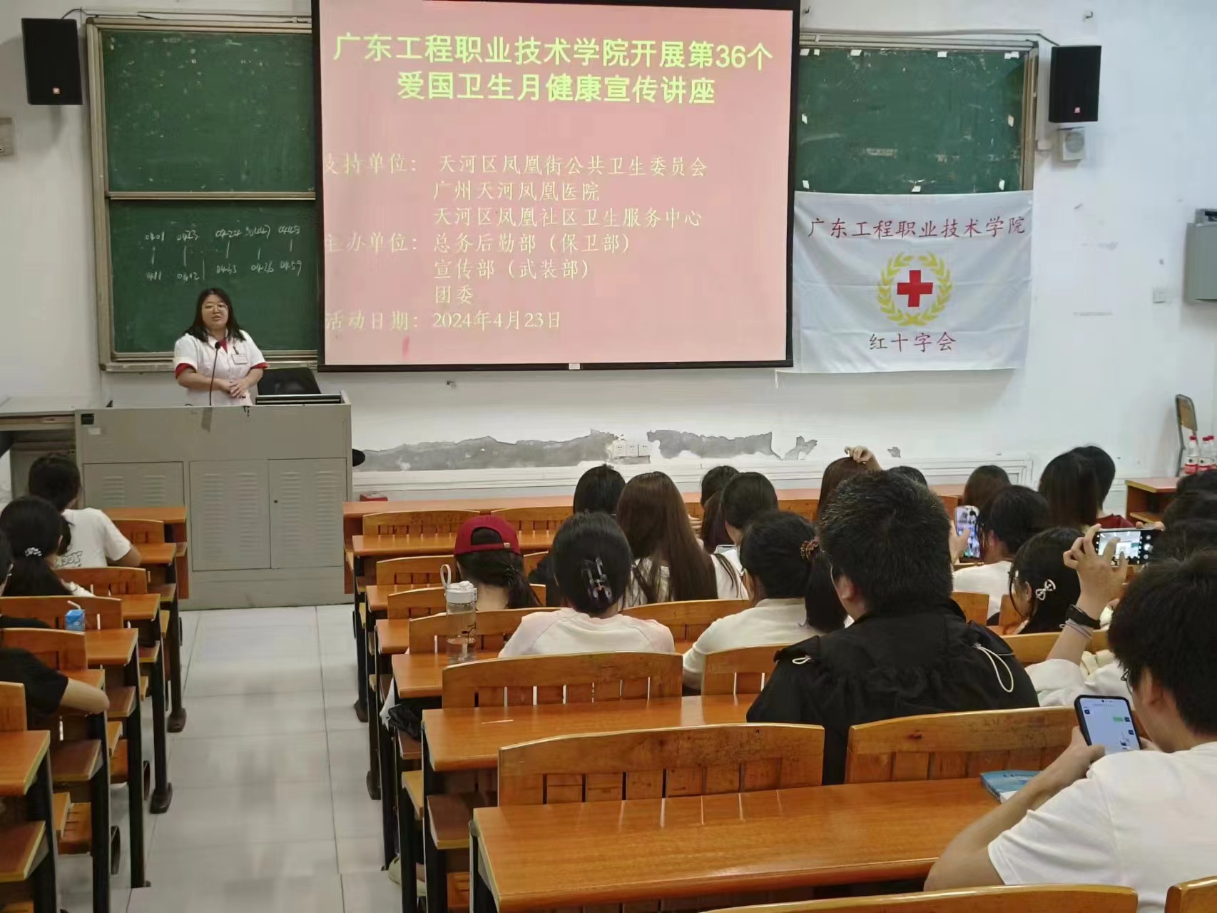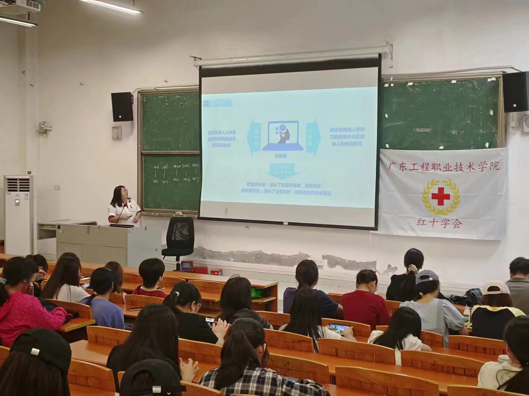 本次讲座特邀请到天河区凤凰街社区卫生服务中心孙芬医生、清城区疾病预防控制中心传染病预防控制股股长梁瑞贤、清城区东城社区卫生服务中心李艳丽妇产科医生来校开展健康专题讲座。中午,分别在广州校区实训5-101室和省职教城(清远)校区Q1-110室举行。通过二级学院的大力宣传及校园广播宣传,超过400名学生参加讲座。课堂上学生认真听课,医生围绕传染病防治知识,让学生了解流感、结核病、登革热的传播途径及预防措施,以及女性预防保健等内容。通过典型案例分析的形式,深入浅出地让学生了解常见病、传染病对人体健康的危害、传播有效地预防措施,同时增强女性保健的认知水平,提醒学生加强个人防护,保持良好的生活习惯。