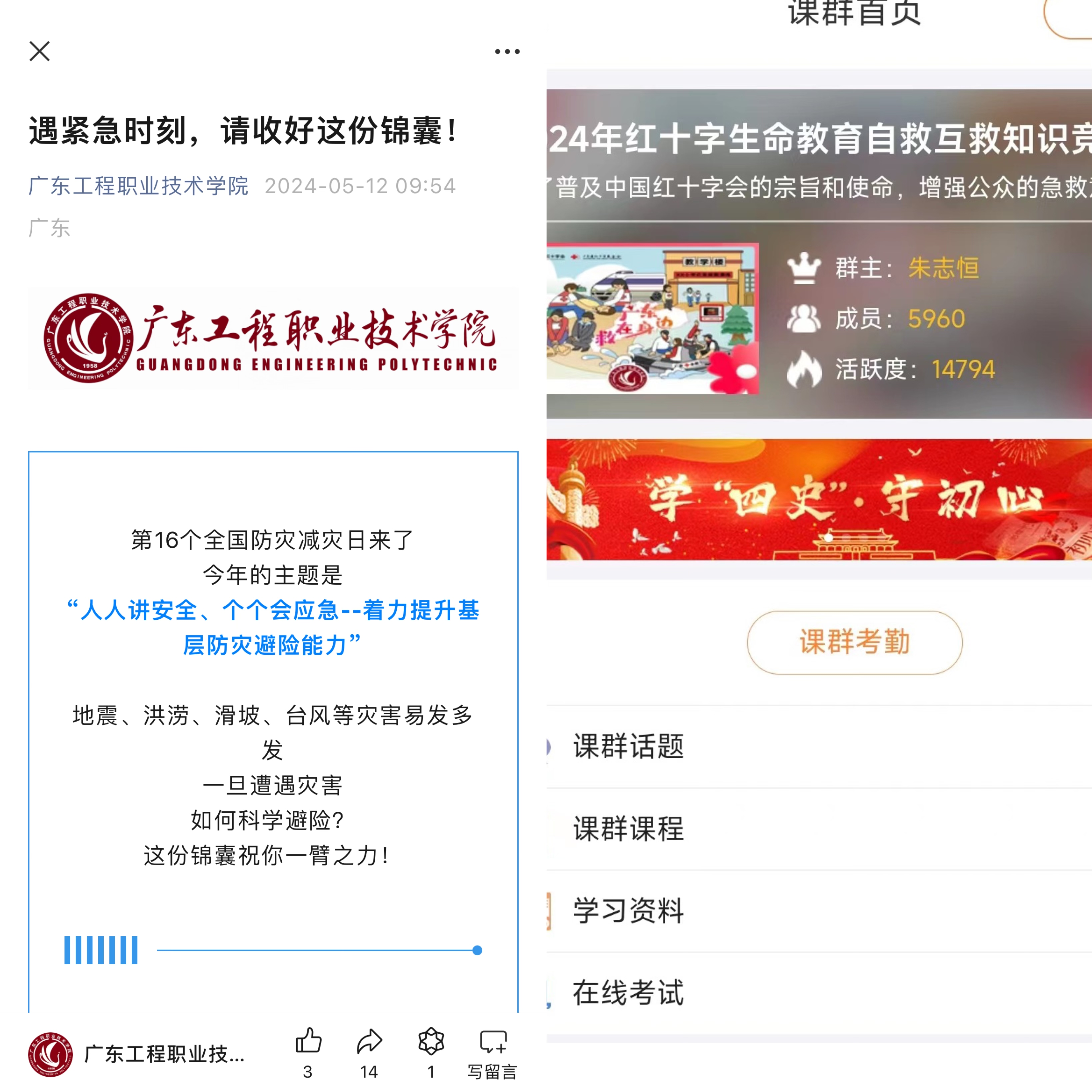 5月12日-5月27日,总务后勤部(保卫部)、宣传部(武装部)、学生工作部、二级学院联合组织开展“防灾减灾卫生应急进校园”和“庆祝中国红十字会成立120周年暨2024年红十字生命教育自救互救知识竞赛”活动,通过公众号推文、宣传教育课、易班平台开展知识有奖答题、观看影视作品等多种形式开展活动,有效提升学生防灾避险基本知识,为全面普及应急救护知识,提高学生自救互救能力。