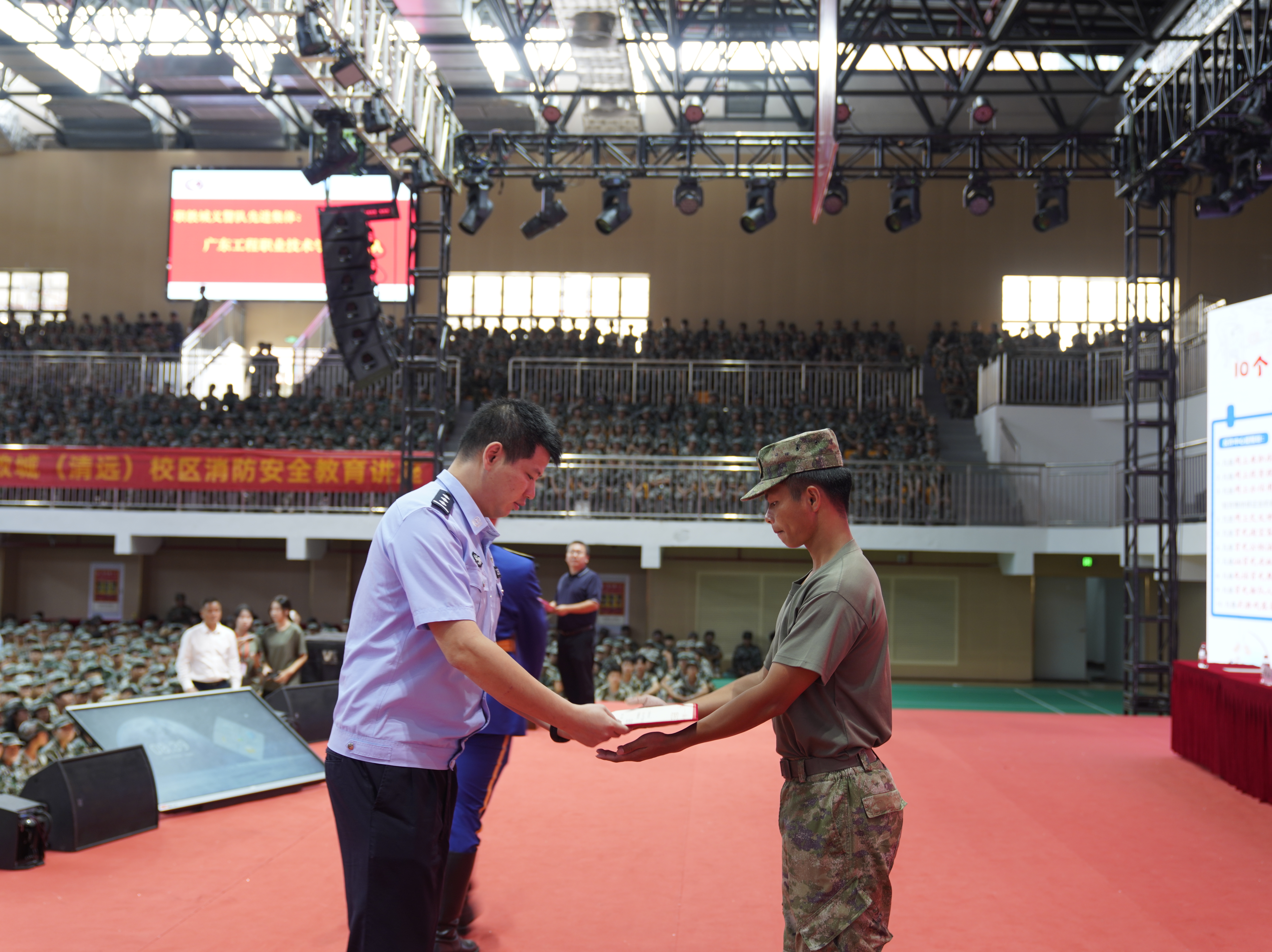 活动中,我校省职教城(清远)校区义警队进行了换届交接仪式。交接完成后,全体新生进行了反诈承诺宣誓。在领誓人的带领下,省职教城(清远)校区全体新生起立举起右拳,作出了防诈、反诈的庄严承诺。