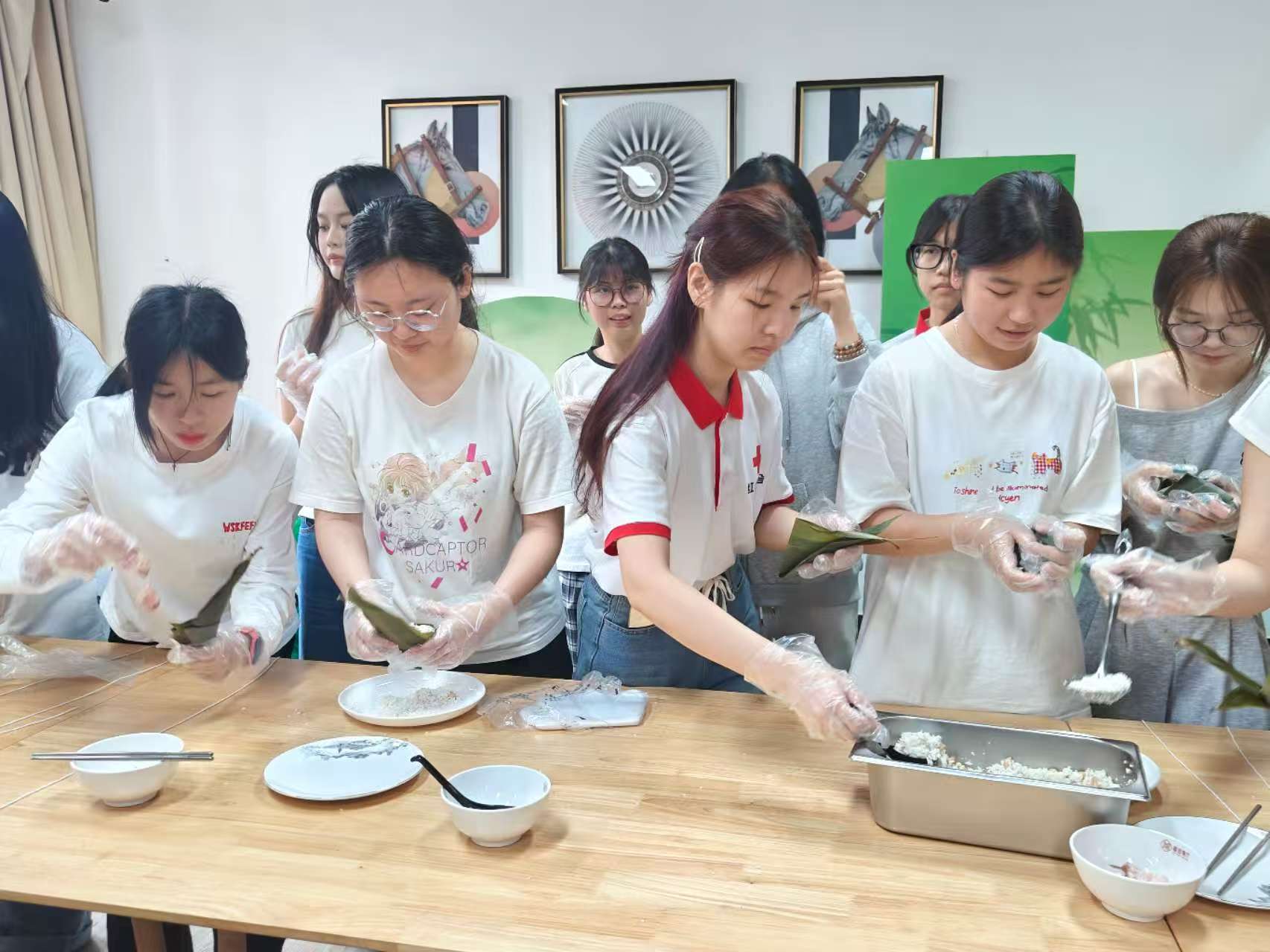 粽叶飘香迎端午,传统文化润心田。5月30日中午,学校两校区同步开展“万水千山‘粽’是情 端午佳节共欢庆”端午节主题活动。食堂当天中午共计发放5000个粽子给师生品尝,学校党委书记叶忠明,党委副书记、校长李丽,党委副书记、纪委书记徐振昌,党委委员、副校长吴志敏,党委委员、副校长张永强与两校区师生共同参与活动,共度端午佳节。参加活动的有各学院学生代表、青马班学员代表、红十字会与义警队代表,还特邀了我校国际学生一同参与活动,让外国友人通过传统美食制作感受中华传统文化的深厚底蕴。