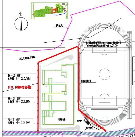 二、围蔽区域:施工地块东至操场第四跑道处、南至车陂涌、西至 8-10 栋宿舍、北至北边围墙运动场入口路缘石。