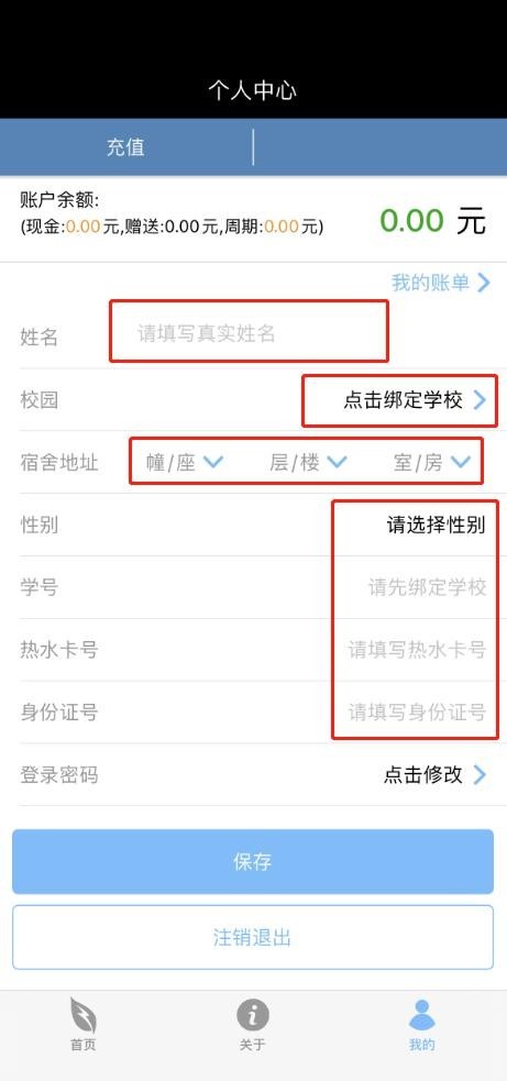 2.在APP【我的】选项中完善个人中心的信息,包括姓名、宿舍地址(楼栋→楼层→房间号)、性别、学号、登录密码等,逐一点击设置。