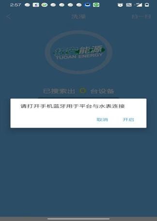 4.【搜索洗澡】:根据提示信息开启蓝牙并开放检测功能;点击选择绑定的设备(设备名称与房间号相同才可使用),并点击【开始洗澡】按钮。