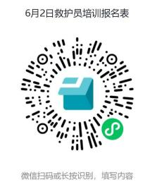 微信扫描“救护员培训报名表”小程序填写报名信息(必须确认培训当天到场才报名),名额有限,报名成功后加入