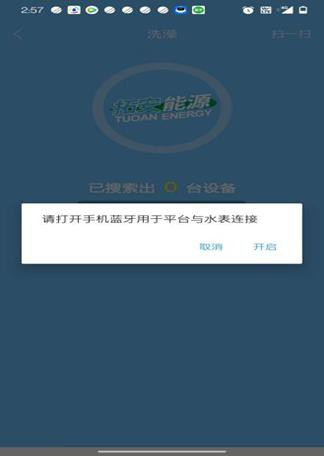 (4)【搜索洗澡】:根据提示信息开启蓝牙并开放检测功能;点击选择绑定的设备(设备名称与房间号相同才可使用),并点击【开始洗澡】按钮。