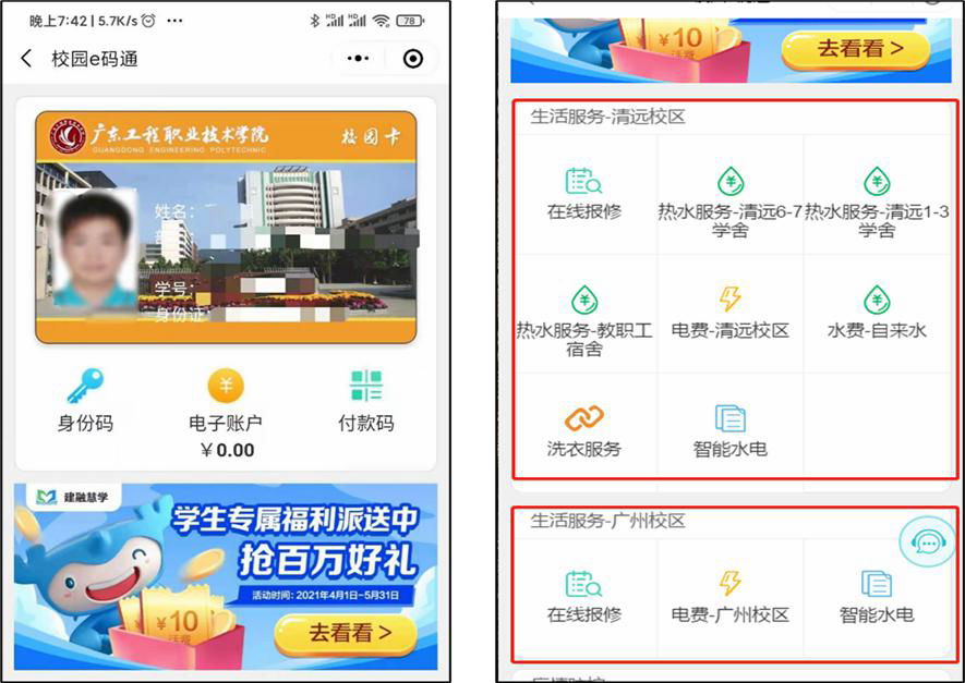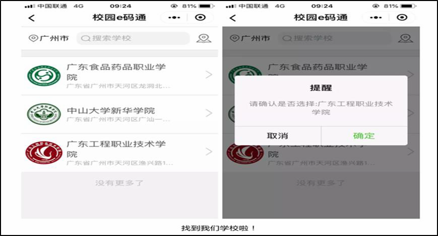 (1)已注册用户在选择学校时请扫描下面②二维码进行【广东工程职业技术学院-广州校区】绑定。