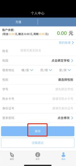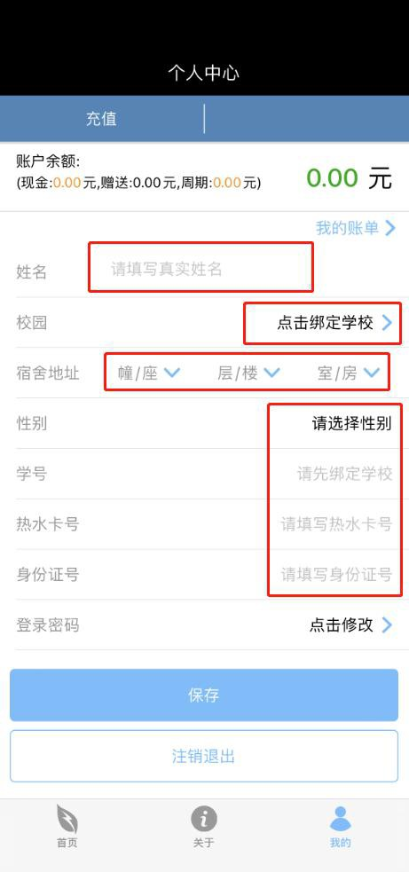 (2)在APP【我的】选项中完善个人中心的信息,包括姓名、宿舍地址(楼栋→楼层→房间号)、性别、学号、登录密码等,逐一点击设置。
