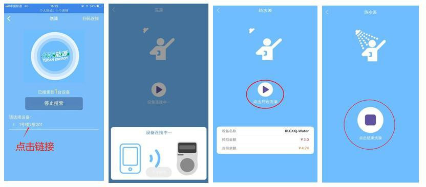 (5)热水使用完毕,点击【结束洗澡】,水表将结算水费,超过20分钟没有使用会自动结算。