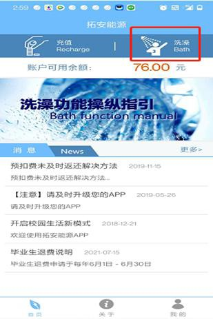 (3)毕业生退费申请于每年6月开始,通过手机端点击【申请退款】将退到关联的支付宝账上。退费只退回自行充值部分,热水服务公司充值部分不予以退费。