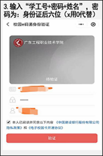 3.输入校园卡账号、密码及姓名;账号为学号,密码身份证后6位(有X改为O),进行身份验证并选择“暂不开通电子钱包”。
