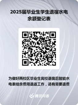 1、两校区使用智能水电表的学生公寓预充值余额退还请有需要申请水电费退费的毕业生宿舍以宿舍为单位,派一名宿舍成员代表扫码填写问卷相关信息,同一宿舍只退费一个账号,重复填写无效。