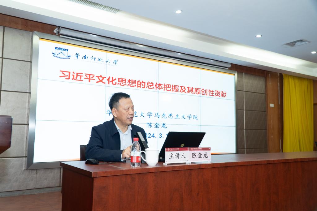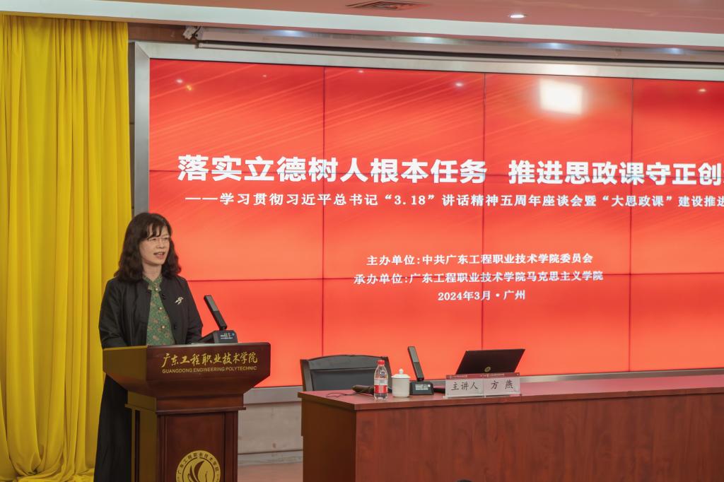座谈会上,教育部“长江学者”特聘教授、华南师范大学马克思主义学院陈金龙教授谈到他当年参加全国学校思政课教师座谈会感受时说,习近平总书记的重要讲话具有人民情怀、担当意识、历史眼光、战略眼光和世界眼光,五年来,全国高校思政课发生了格局性变化,取得显著的建设成效。随后,陈金龙教授以题为“习近平文化思想的总体把握及其原创性贡献”做了主旨报告,他从习近平文化思想的总体把握、坚定文化自信作为文化建设的前提、建设中华民族现代文明、“两个结合”作为文化建设方法、全球文明倡议推动人类文明发展五个方面阐述了习近平文化思想的原创新贡献;党的十九大代表、广东技术师范学院网络空间安全学院党委书记陈小花教授以“基于大学生思想政治教育难点热点的育人方法提升与思考——全国思想政治理论课教师座谈会召开五周年有感”为题分享了五年前参加“3·18”座谈会时的感悟和历程,以及五年来对大学生思想政治教育难度热点育人方法的经验与思考;广东水利电力职业技术学院马克思主义学院院长林冬妹教授以“弘扬教育家精神 争做时代思政大先生——重温‘3.18’讲话精神 凝聚铸魂育人力量”的主题报告,与会老师收获满满。