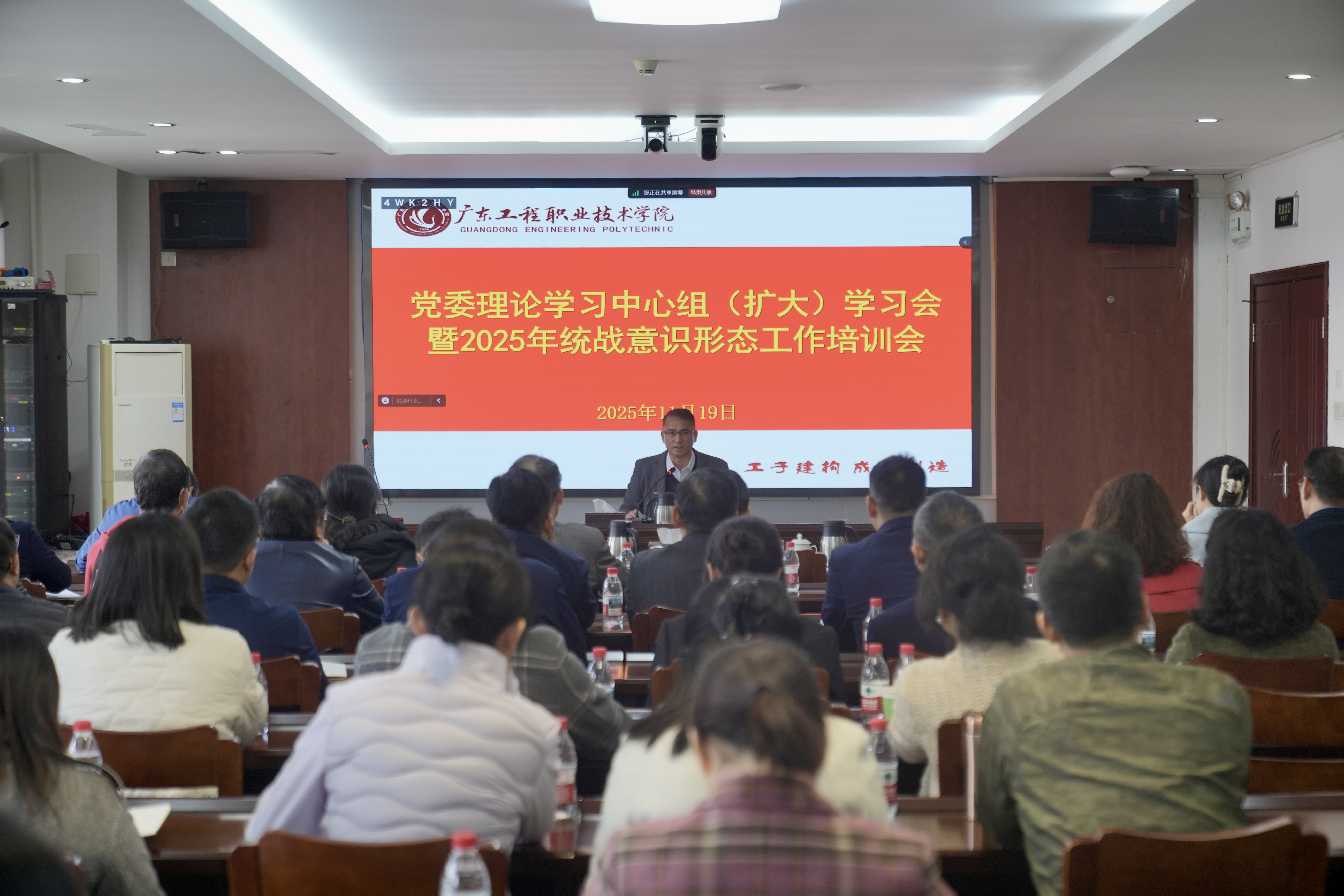 2025年11月19日,学校在广州校区511室和省职教城校区办公楼报告厅通过视频连线的方式召开党委理论学习中心组(扩大)学习会暨2025年统战意识形态工作培训会,会议邀请广东省社会主义学院杨竞业教授作专题辅导。全体校领导、中层干部、各级党组织统战委员、宣传委员和辅导员代表参加会议。学校党委书记叶忠明主持会议。