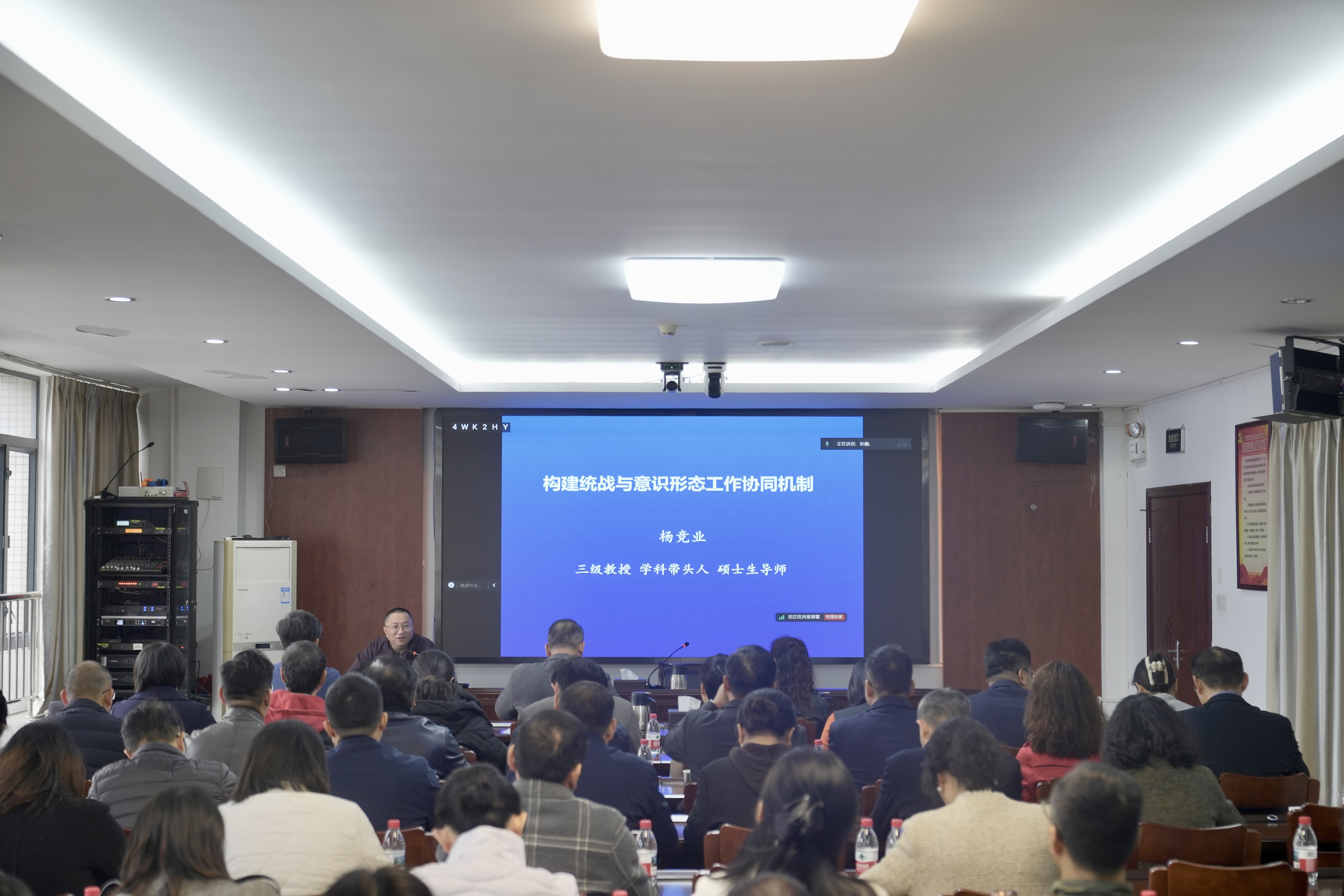会上,杨竞业教授以《构建统战与意识形态工作协同机制》为主题,结合学习贯彻《党委(党组)落实统战工作责任制规定》,从新时代我国意识形态安全面临的重大挑战、统战工作与意识形态安全的新使命新要求、协同推进高校统战工作与意识形态工作的举措三个方面展开了系统解读。整场报告站位高远、内容丰富,既有政策理论的深度阐释,又有具体案例的精准解析,兼具政治性、理论性与指导性,准确把握了当前统战工作和意识形态工作面临的新形势新任务,切中高校工作实际,对做好高校统战和意识形态工作具有很强的启发和指导作用。