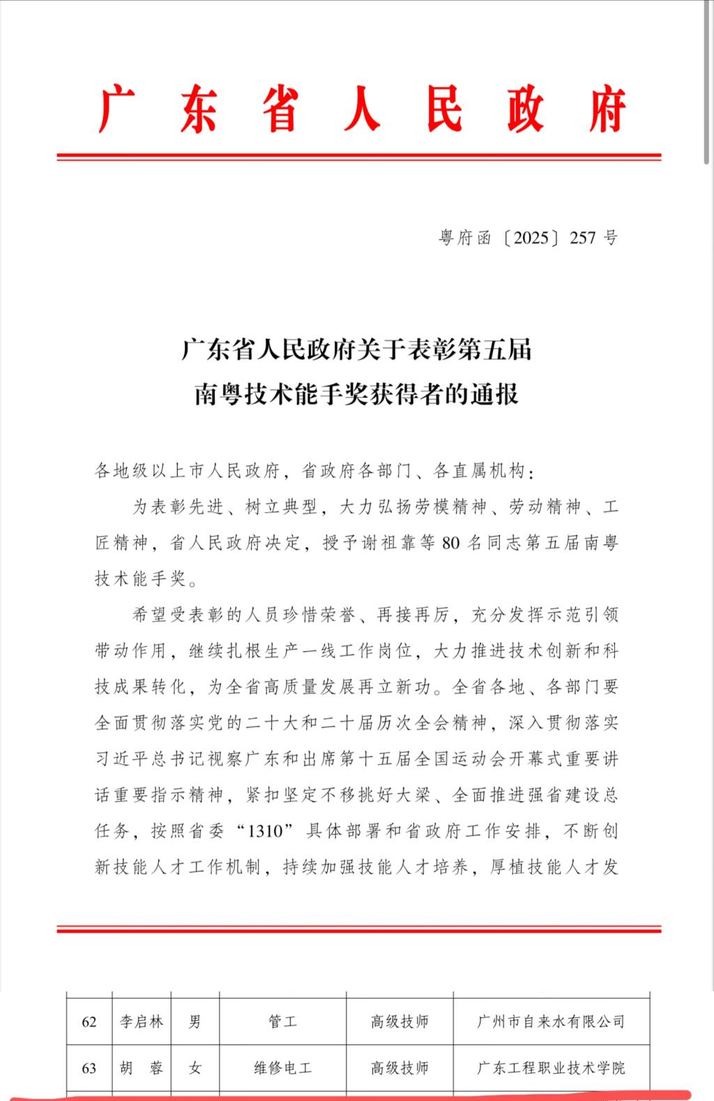 近日,广东省人民政府印发《关于表彰第五届南粤技术能手奖获得者的通报》(粤府函〔2025〕257号),我校先进制造学院(电梯工程学院)副院长胡蓉荣获“第五届南粤技术能手奖”。