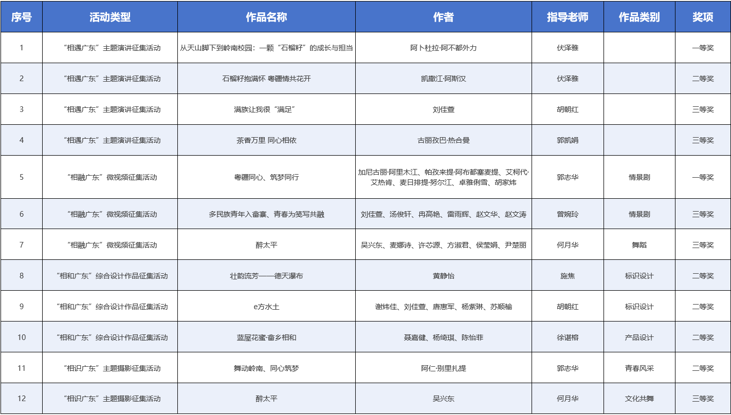 近日,由广东省教育厅主办的2025年“爱在广东”民族团结进步教育活动评选结果揭晓。我校在此次活动中成绩斐然,共获得12项荣誉,其中一等奖2项、二等奖5项、三等奖5项。此次获奖充分彰显了我校在民族团结进步教育领域的工作成效。
