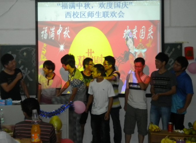 9月30号是中秋佳节,西校区有近百名新生留校。为了让留校新生度过一个难忘的节日,由西校区管理办主办、财经系团总支学生会承办"福满中秋、欢度国庆"的联欢会于中秋晚上在一号教学楼210举行。学院副院长李艇、总务处处长黎惠生、财经系主任周建珊、财经系党总支副书记吴海彬、西校区管理办主任张永强以及西校区各系的辅导员参加了晚会,李艇副院长向留守同学送上了节日祝福并鼓励大家不要怕吃苦,努力提高自身素质,报效祖国。