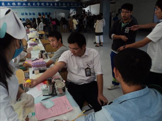 11月1日,校本部实训5号楼大厅,院团委和红十字会在这里组织了大型无偿献血活动,下午1点,献血车还未到校园,大厅里就已经聚集了大量的人群,院红十字会的干部和会员们早早地布置好场地并且井然有序地进入到自己的工作岗位,等待献血的师生们已经按照红十字会工作人员的引导在现场排起了长龙,1点半献血车一到校园,紧张而忙碌的献血工作就开始了。填表、验血、献血、救护、发放献血证有条不紊地立即展开了;现场气氛紧张、热烈、井然有序而且鼓舞人心,一袋袋鲜红的血液从献血者的体内流淌了出来,献血者中有老师,更有大量的同学们。血液是有感染力的,许多原本不准备献血的师生和现场的红十字会工作人员纷纷挽起衣袖,加入到献血者的行列,直到献血结束仍然有许多学生要求献血,无奈天色已晚,考虑到饥饿状态下不利于献血,只好奉劝大家下次再献,献血活动直到7点钟才结束,当天有363人捐出了鲜红的血液。