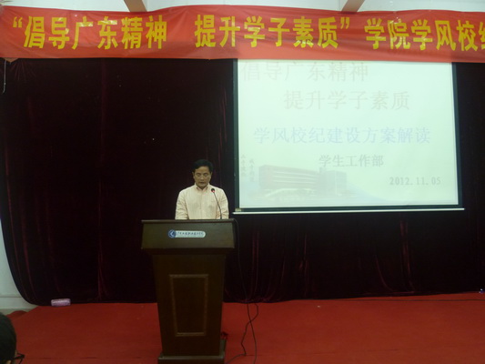 启动仪式上,张华部长介绍了学院开展以"倡导广东精神 提升学子素质"为主题的学风校纪建设活动,目的是要用"厚于德、诚于信、敏于行"的新时期广东精神引领广大学生,争做品学兼优的合格人才。并通过视频展示回顾了学院2010-2011年开展学风校纪建设活动情况。