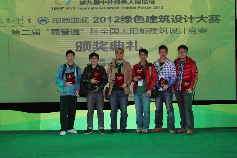 近日,由住房和城乡建设部科学技术委员会、国家发展和改革委员会国际合作中心、联合国环境规划署可持续建筑促进会(UNEP-SBCI)联合主办,招商局地产控股股份有限公司承办的"第九届中外绿色人居论坛"暨"2012年全国绿色建筑设计大赛颁奖典礼"于江苏常州举行,我校建筑工程学院李东锋老师应邀参加大会。由李东锋老师指导,建筑设计技术专业大三学生梁海强及华立学院周围、高航等同学共同完成的参赛作品---《北固湾绿色社区中心方案设计》荣获大赛"创意奖"。我院是本次大赛晋级决赛的唯一高职院校!