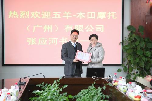 学院党委书记刘文清博士、院长劳汉生教授分别在会上致辞及讲话。劳院长在欢迎辞中一再强调五羊-本田摩托(广州)有限公司是全球知名摩托车生产企业,是中国最大的摩托车生产商之一,与优质的知名企业开展高端深度合作是我院的发展战略,校企强强联合,有助于校企产学研共同发展,有助于把我院早日建成人民满意、特色鲜明,在全国乃至国际有影响力的高职大学。刘文清书记在讲话中表示,强校必先强师,学校在深入推进校企合作的过程中,广泛吸引专家、学者,建设杰出专兼教师队伍,为培养与企业对接的高技能人才搭建了良好的平台。现在我们又聘请了五羊-本田的高管张应河书记为我们的客座教授,这为我们办好人民满意、特色鲜明、具有引领示范作用的高职大学增添了无穷的力量!五羊-本田摩托(广州)有限公司张应河书记在接受刘文清书聘书后表示,决不辜负学院领导的重托,充分整合五羊-本田的优势资源,通过校企合作,实现"人才兴校"、"科技强企",提高企业高技能人才文化知识水平,促进员工全面发展的人才培养目标。