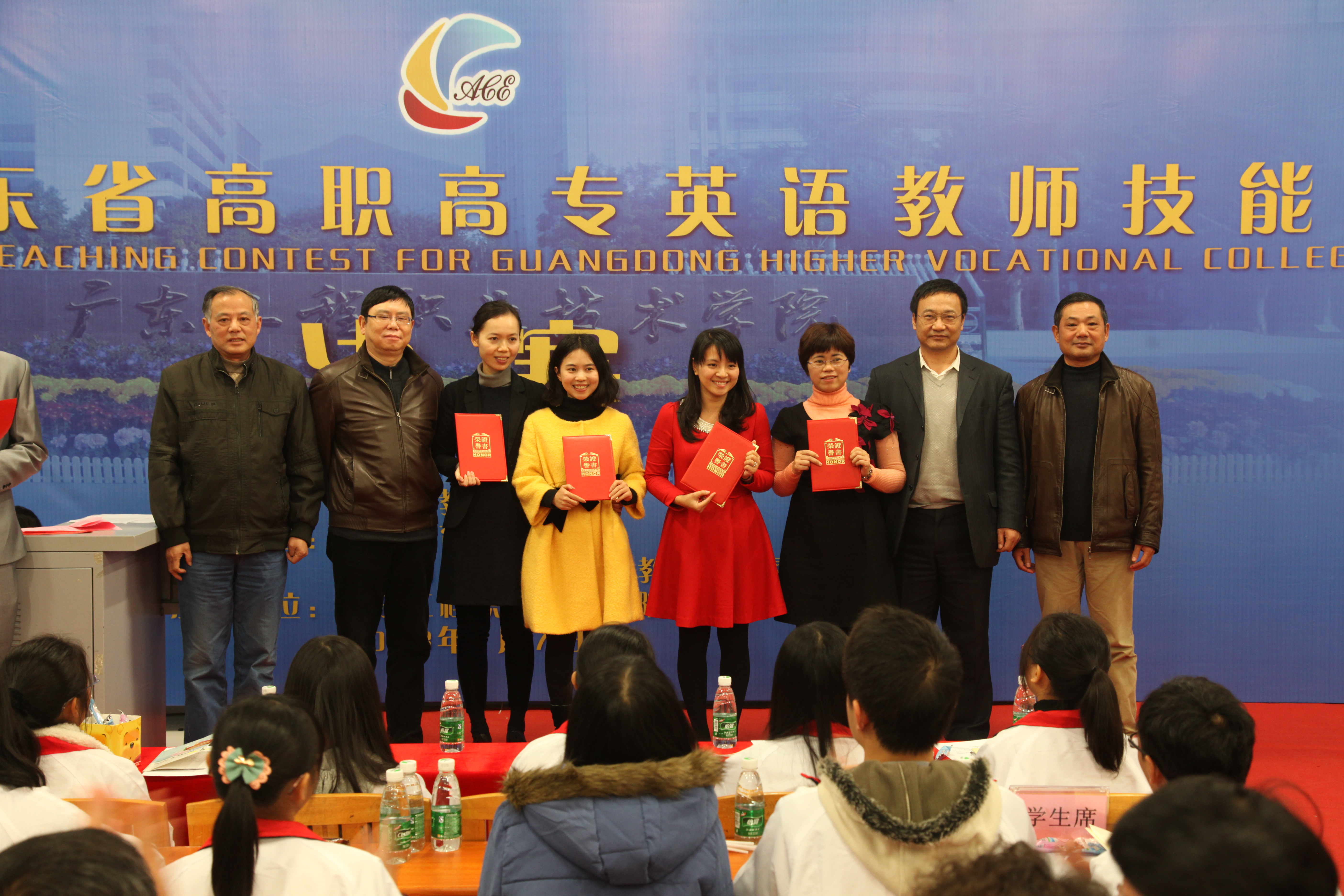 1月7日,由广东省教育厅主办,高等教育出版社、广东省高职高专英语教学指导委员会合办,我院承办的"广东省第三届高职高专英语教师教学技能大赛总决赛"在我院举行。本次大赛共有59所学校参加初赛,经过评委们筛选,确定了20所高职院校参加总决赛。经过近9个小时的紧张角逐,最后来自广州民航职业技术学院的李理老师、广东环境保护工程职业学院刘晓毅老师、深圳职业技术学院的朱小晶老师、广东职业技术学院华海燕老师以优异的成绩获得本次大赛一等奖。我院钟洁铃老师凭借别出心裁的教学设计、出色的课堂驾驭能力以及流畅的语言表达能力,荣获大赛二等奖。我院赖伟玲老师获得优胜奖。