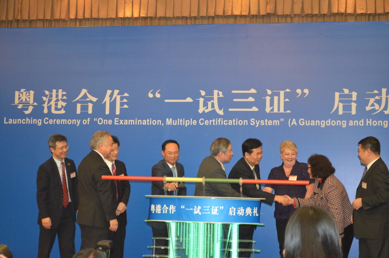 3月22日,由广东省人力资源社会保障厅、香港职训局主办的"粤港合作‘一试三证'启动典礼"在广州白云国际会议中心举行,广东省委组织部副部长、省人力资源和社会保障厅厅长欧真志、党组书记林应武,香港职业训练局主席陈镇仁,国际标准专业联盟(IPSN)主席Jeanette Allen等领导出席了典礼,并为首批44名通过"一试三证"的考生颁发证书。IPSN成员国及英国等国际行业、粤港澳地区行业、企业代表,以及职业技能鉴定专家和考生代表参加典礼。