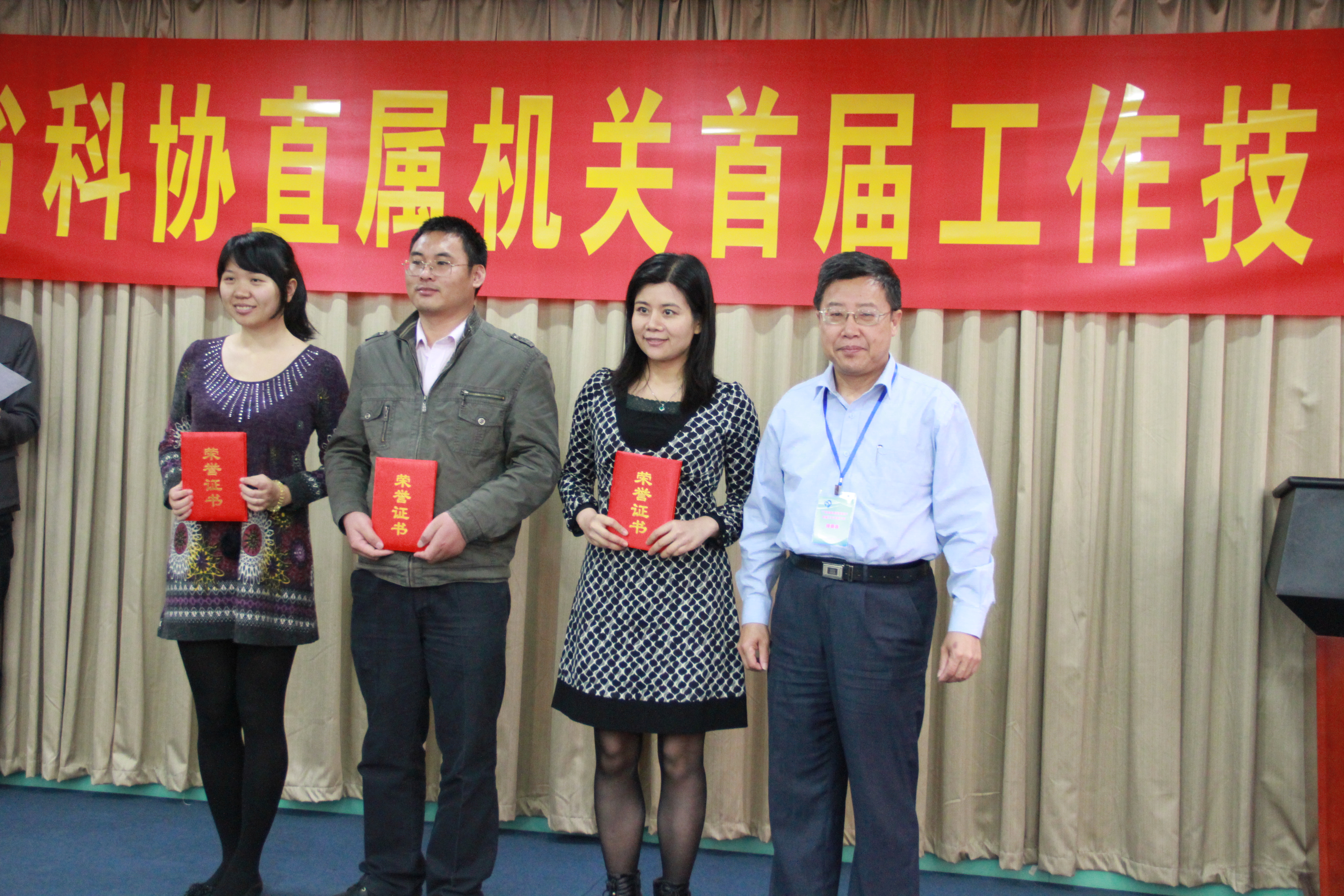 省科协直属机关党委副书记、党办主任黎伟民为获得比赛二等奖选手颁奖
