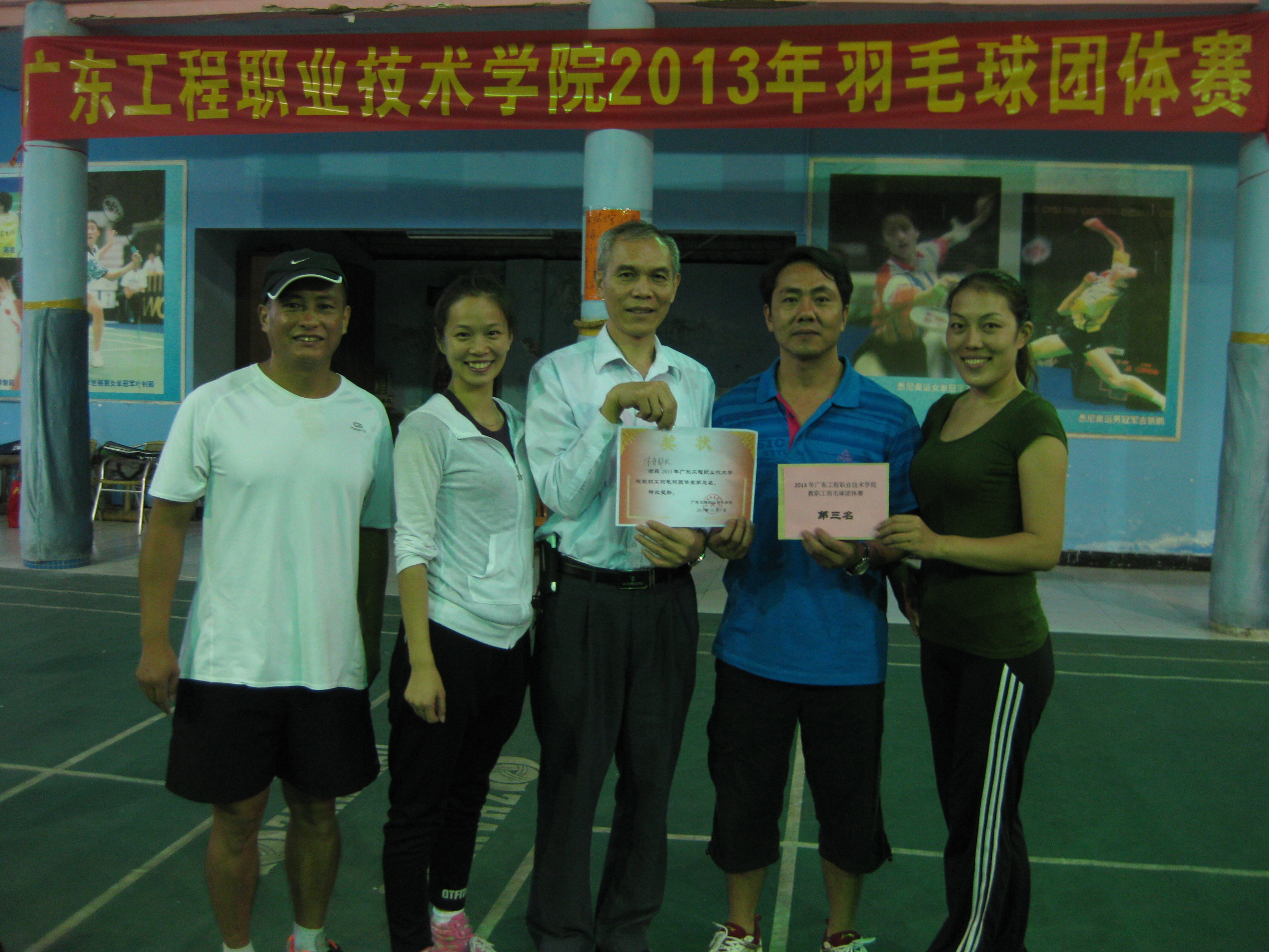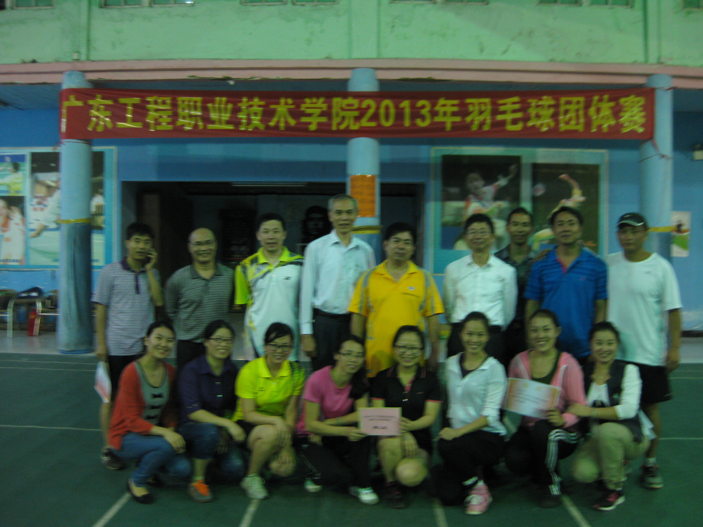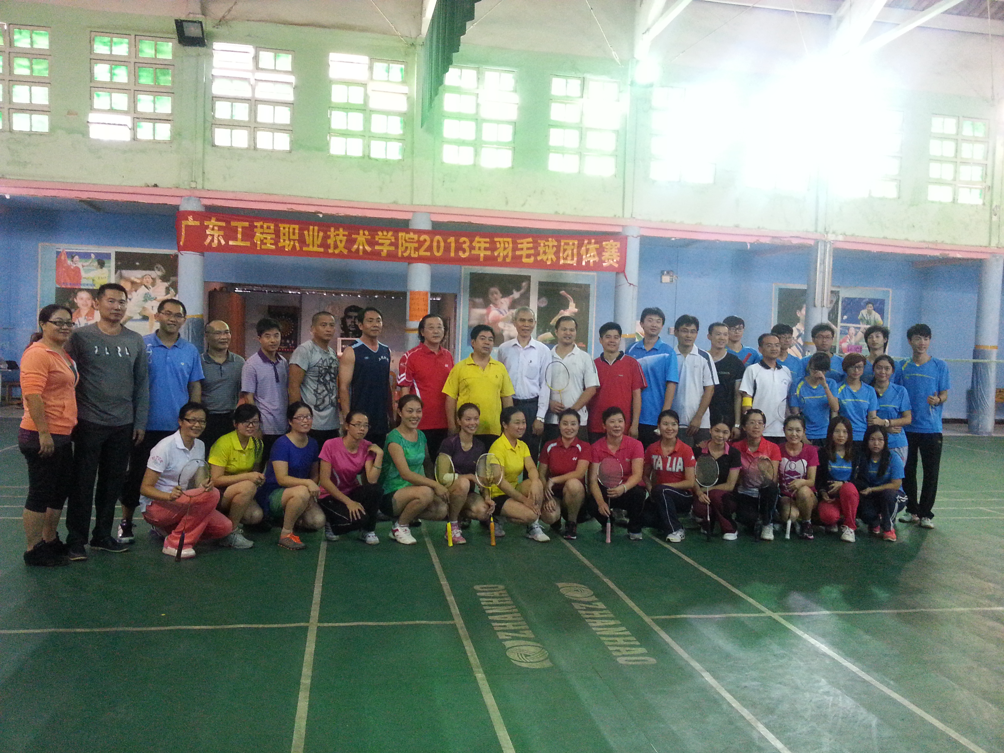 11月7日下午,由学院工会主办、体育部承办的2013年广东工程职业技术学院教职工羽毛球团体赛在凤凰羽毛球馆举行。本次比赛有9个参赛队,共18个工会小组参赛。比赛以男双、女双和混双的成绩记团体总分,采取每局21分、每盘三局两胜制。比赛首先进行小组循环赛,各小组前两名进入淘汰赛,再由获胜的3个队进行循环赛确定前三名,负的三个队进行循环赛确定4到6名的名次。