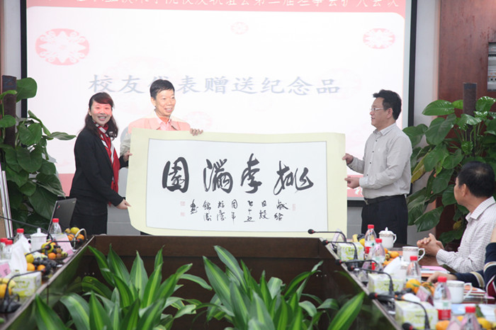 为了庆祝母校建校55周年,校友代表通过赠送母校礼物表达了对母校的爱及感恩之情。八九届校友向学校赠送了他们亲自设计制作的纪念品"雕 凿",河源校友袁瑞强、廖怀志送了一份校庆纪念品,汕尾校友施锦涛把他的墨宝——一幅字画"桃李满园"献给母校,学院领导欣喜地接受了礼物,感谢各地、各界校友对母校的情谊。校友联谊会送给校友们的礼物是两本纪念册,一本是名为《母校记忆》的校友回忆录,一本是名为《培桃育李满天下》的校友名录,这也是送给母校55周年的生日礼物。接下来老校长何斌教授、汤少明教授谈到了他们的感受和期望,他们感慨学院55年来创业的艰辛,祝愿并寄语学院的明天会更好!他们还对校友们提出了很高的期望,热切地希望各位校友理事一如既往地关心和支持学院的建设与发展。校友联谊会副会长,65届工民建建筑学本科班陈中翰代表校友会理事发言,他表达了对母校培育的感激之情。他说,一界又一届学子从母校身上汲取力量,走上了人生创业发展之路,今后无论身在何时、何地,都会始终牢记母校和老师们的谆谆教诲,不断加强学习和历练,不断提高自己的道德素质和职业能力,在各自的工作岗位上实现新的更大的人生价值,为母校争光添彩。各地校友代表也做了发言。校友联谊会会长陈杰伦副教授一直在指导校友联谊会开展工作,他谈到了对校友会工作的展望,他期望校友们为学校发展献计、献策、献力,建言立论,共商办学大计,为学校继往开来,再谱新篇,再作贡献。