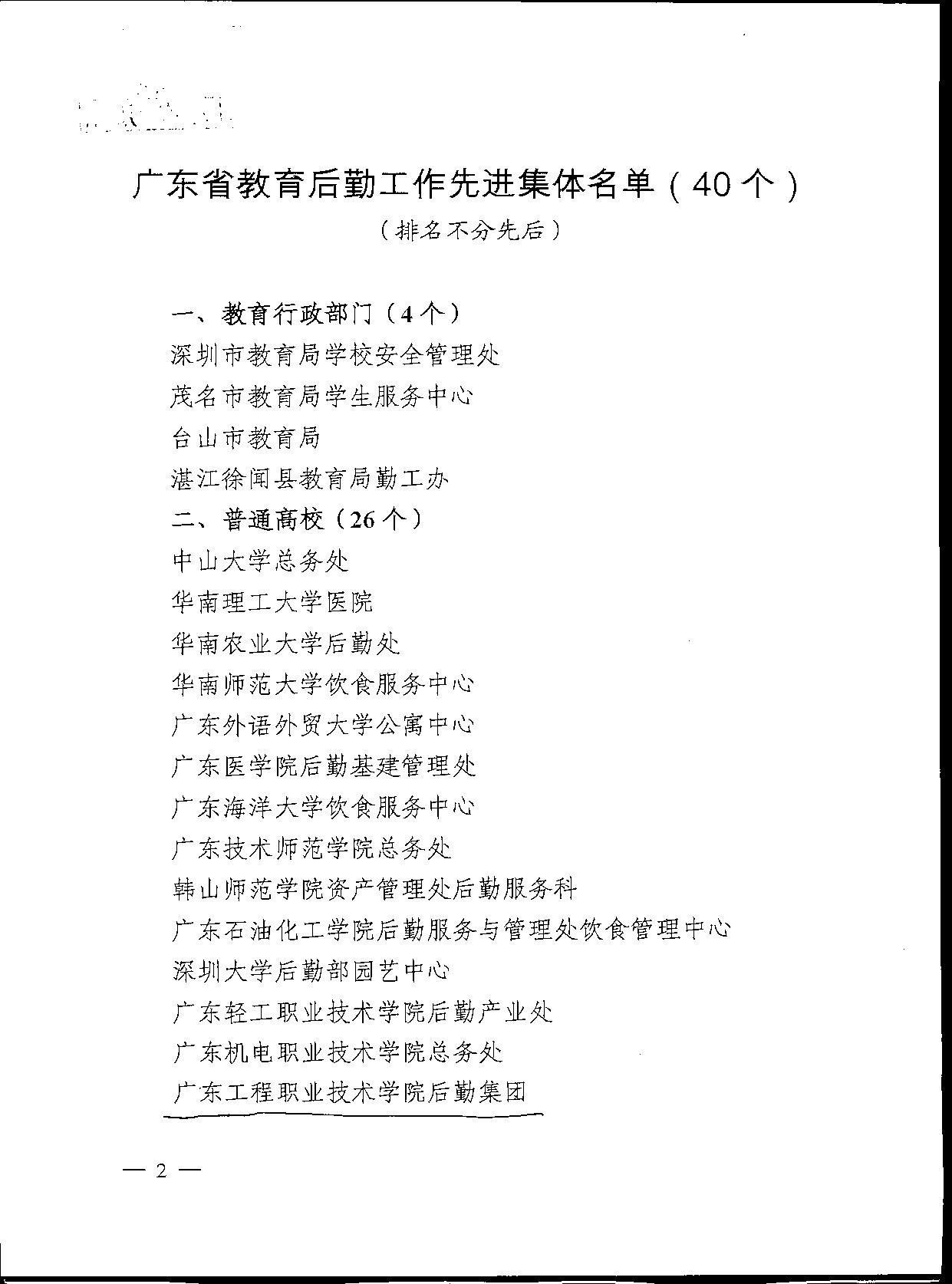 5月29日,我校后勤集团荣获广东省教育厅评定"广东省教育后勤工作先进集体"称号。此次评选由广东省教育厅主办,目的是为了弘扬先进,树立典型,增强后勤队伍凝聚力,确保我省教育"创强争先建高地"战略任务和我省高校"创新强校"工程的顺利实施。
