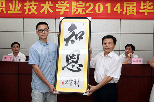 学校党委温孝胜副书记宣读《2014届优秀毕业生表彰决定》,并由温孝胜副书记、李军副书记、李艇副校长、徐启扬副校级干部为优秀毕业生颁发荣誉证书。最后,由劳汉生校长颁发毕业证书。