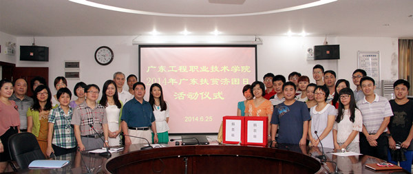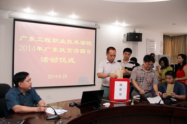 6月25日上午,由我校工会和团委共同组织的2014年"广东扶贫济困日"捐款仪式顺利结束。仪式由工会专职副主席钟向忠主持,党委副书记、纪委书记温孝胜、工会专职副主席陈纪锋、团委书记黄馥丽、团委副书记李冠文、陈雪婧、各工会小组长和团总支书记等出席了仪式。