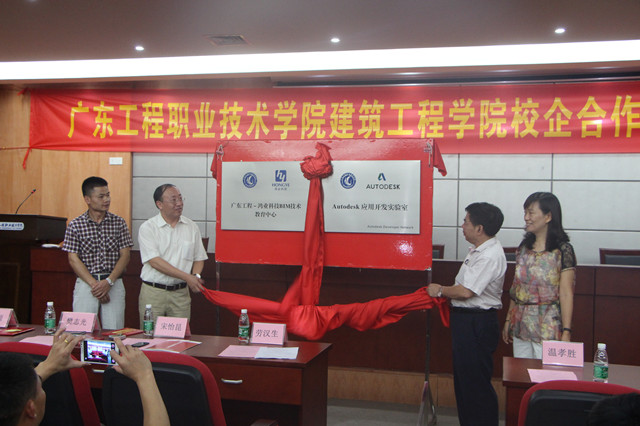 紧接着,宋怡昆简要介绍了鸿业科技公司的校企合作情况。该公司已向清华大学、同济大学等35所国内著名本科高校赠送专业软件并开展校企合作,而我校是该公司唯一赠送价值1260万元专业技术软件的高职院校。他对我院BIM中心的发展给予了充分的肯定,坚定了与我院深入开展校企合作的决心。同时,Autodesk公司也向我院捐赠了价值500万美元的BIM软件。接下来,温孝胜书记、赵冬院长、宋怡昆和樊志光共同为广东工程—鸿业科技BIM技术教育中心和Autodesk应用开发实验室揭幕。