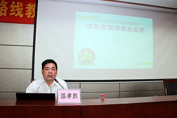 为深入贯彻《广东省党的群众路线教育实践活动总结大会精神》和习近平总书记系列重要讲话精神,结合我校纪律教育学习月活动安排,10月9日下午,学校党委副书记、纪委书记温孝胜为学校全体党员、科级及以上行政人员、中级及以上职称教学教辅人员作了题为《茂名官场窝案及反思》的反腐教育专题讲座。