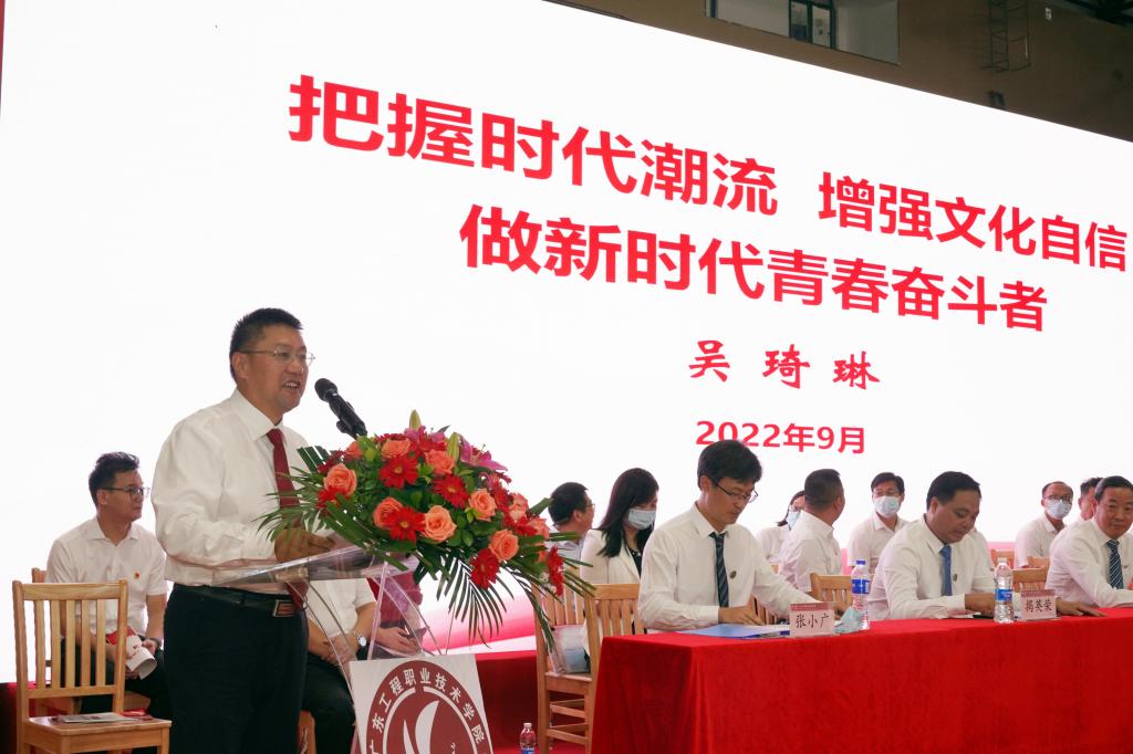 党委书记吴琦琳以《把握时代潮流 增强文化自信 做新时代青春奋斗者》为题,为全体新生讲授“思政第一课”。分别从“把握新时代10年伟大变革”和“如何做新时代青春奋斗者”两大方面展开,深入阐述了新时代10年以来以及当前国内的政治经济、社会文化和生态文明建设发展的形势,结合青年成长成才的特点,从树立远大理想、热爱伟大祖国、担当时代责任、勇于砥砺奋斗、练就过硬本领和锤炼品德修为六个方面对同学们提出了期望和要求。并勉励同学们在今后的大学生活里积极响应党的号召,努力成为堪当复兴大任、扛起强国之责的大国工匠,为实现中华民族伟大复兴的中国梦贡献力量。