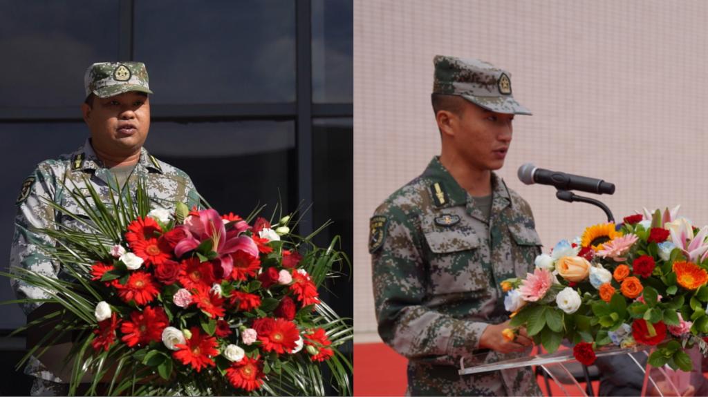 承训部队教官张少锋、李荣根代表教官发言。他们承诺严格要求,按纲施训,确保高质量完成军训任务。希望参训学生服从命令,听从指挥,团结同学,严守纪律,吃苦耐劳,勤学苦练,铸就青春向党的赤子之心,展现令行禁止的军人气魄,养成使命必达的军人作风。