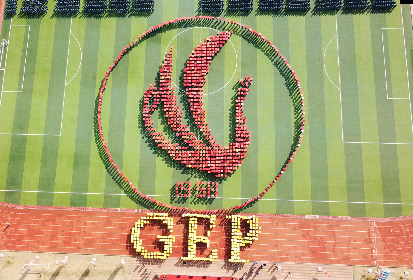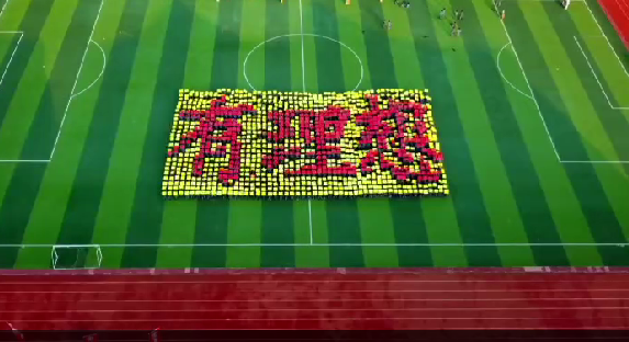 振奋人心的文化方阵汇演掀起了展演的最高潮。“航母”与“战斗机”造型缓缓走向训练场。党的二十大对青年发出号召“怀抱梦想,脚踏实地,敢想敢为,善作善成,有理想,有担当,能吃苦,肯奋斗”的字样以及党徽、校徽等图案一一在方阵中勾勒。主题鲜明的图案、嘹亮的口号、深情的解说,展示了广东工程学子积极向上的精神风貌,表达了他们爱党爱国爱校的深切情感。
