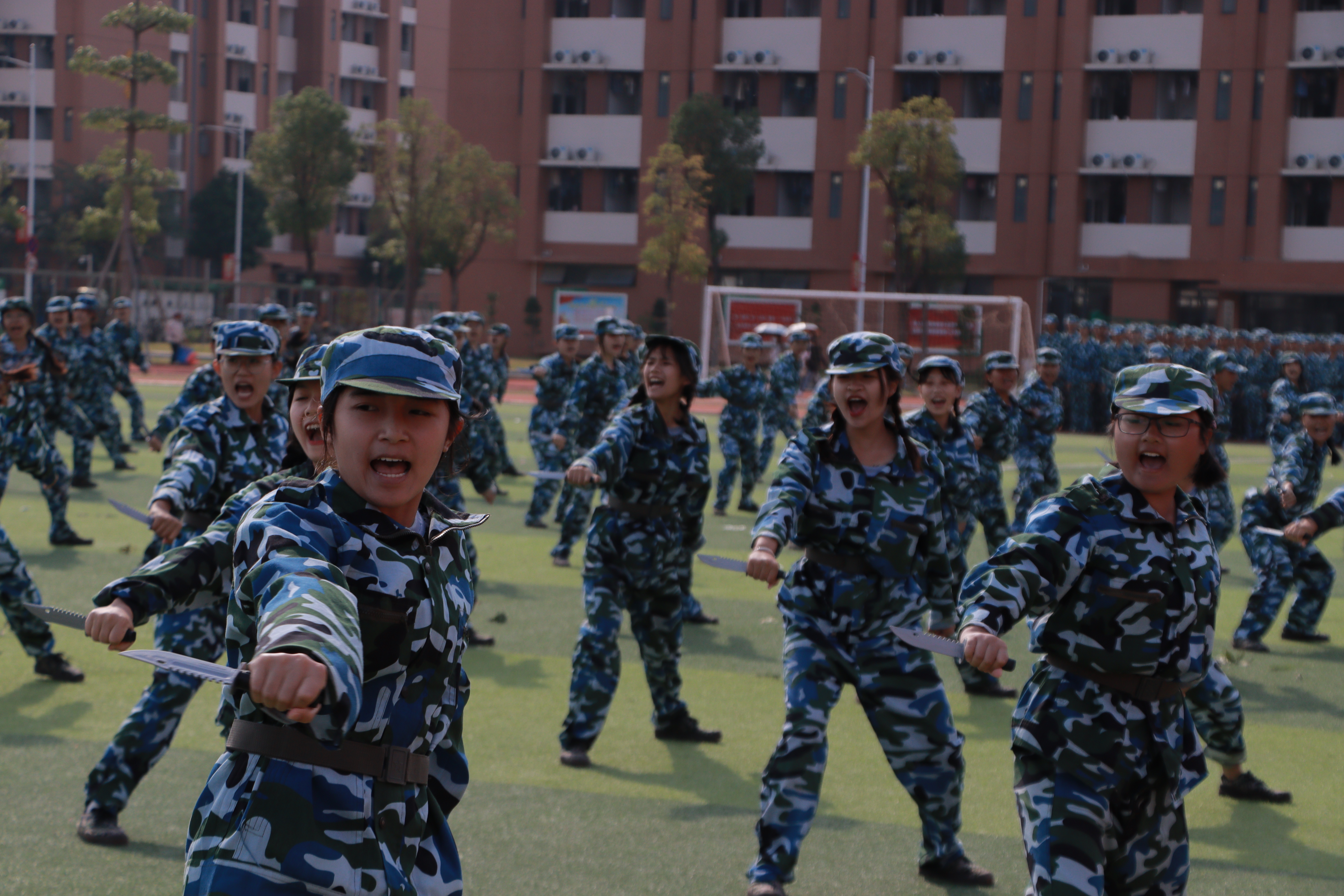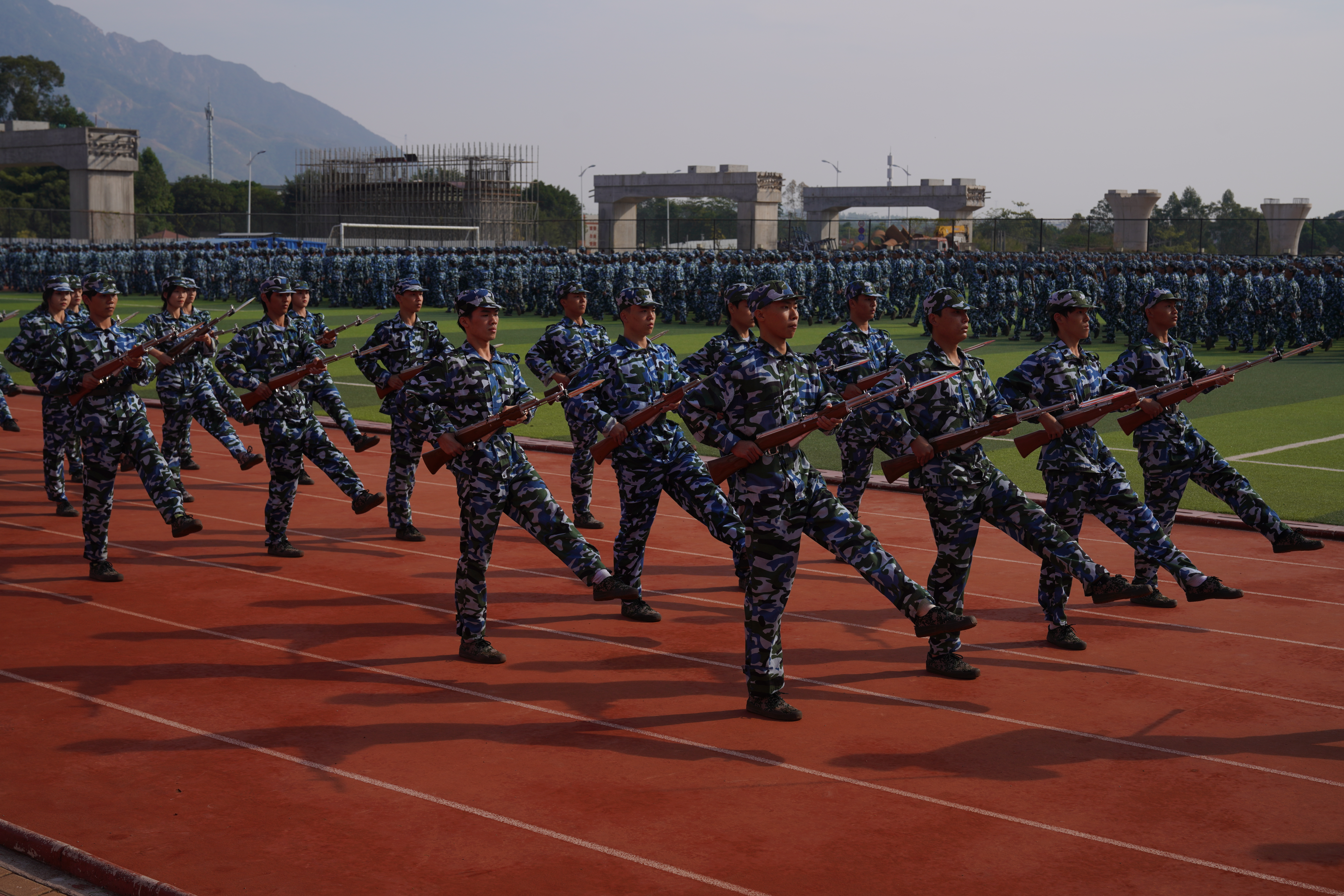 伴随着雄壮的国歌声,新生班国旗护卫队迈着坚毅的步伐出旗,冉冉升起了五星红旗。党委书记吴琦琳向军训团发出指令,分列式方阵踏着稳健的步伐,喊着嘹亮的口号,军姿飒爽、整齐划一地走过主席台。