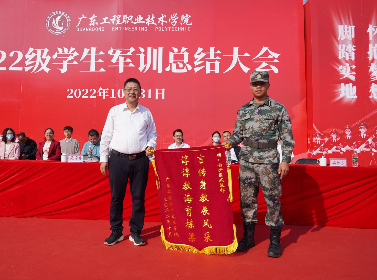 党委书记吴琦琳向承训单位南沙武装部赠送锦旗,向军训优秀教官代表、军训优秀连队颁发了证书和锦旗。