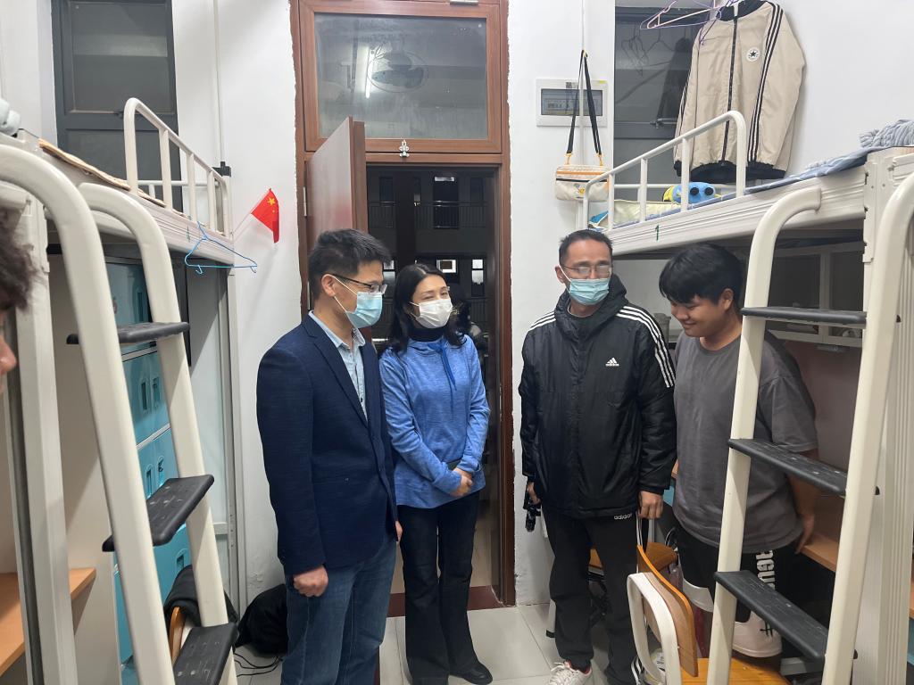 学校领导分别带队走访各学院的宿舍,了解学生疫情期间的学习、生活情况,亲切询问是否遇到困难,有何需要解决的难题。引导学生树立大局意识,积极配合国家疫情防控政策和学校防疫工作,做到理性应对,消除焦虑和不安,不造谣、不信谣、不传谣。告知学生,学校各部门为了全体师生的安全健康和日常生活,正全力以赴,全面做好服务保障工作。