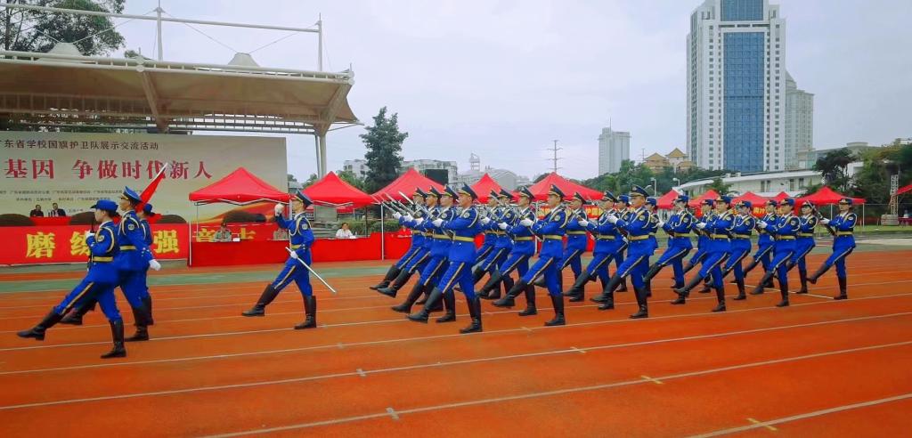 2023年4月25日,我校国旗护卫队到五邑大学参加2022年广东省学校国旗护卫队展示交流活动高职组决赛。在本次展示活动中,与来自省内41所高职院校的国旗护卫队同台竞技,全体队员在赛场上精神抖擞、士气高昂,顺利完成了展示。经过激烈角逐,最终凭借标准的队列动作、规范的队列标准和良好的精神风貌,最终荣获团体总分二等奖,升旗、护旗、指挥和队列展示单项一等奖一个、二等奖两个、三等奖一个的优异成绩。