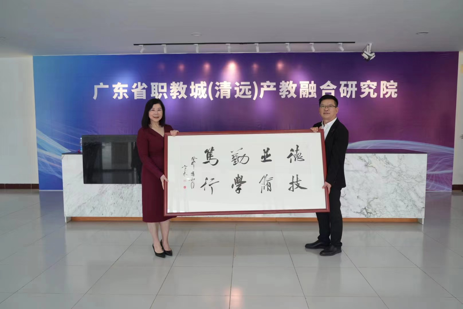最后,林科聪副市长、李庆松一级调研员参观了产教融合研究院并合影留念。清远日报社副社长、原清远市书法家协会主席鲍方义将“德技并修,勤学笃行”书法作品赠予我校。