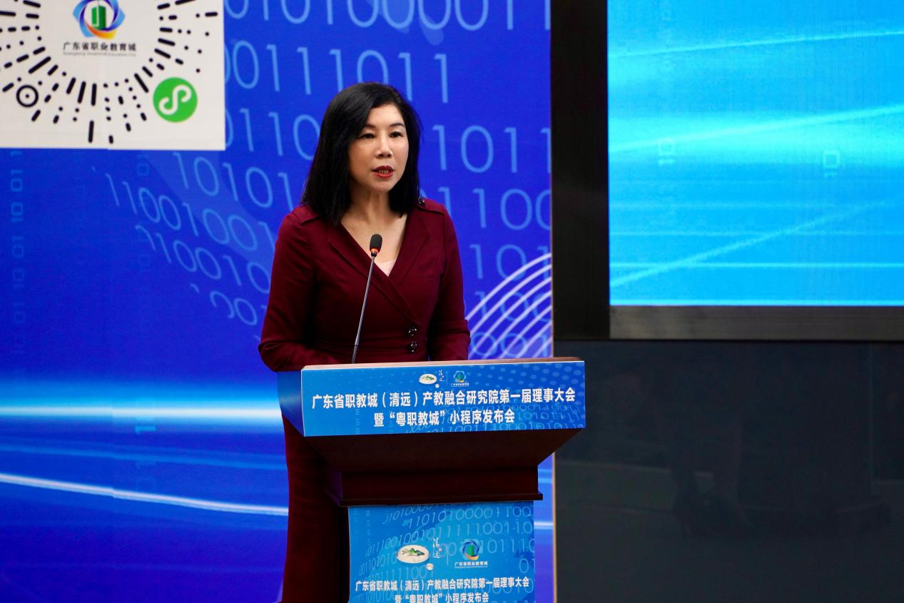 会议第三阶段,广东省职教城(清远)产教融合研究院院长温秀媚向理事单位作工作汇报,学校副校长吴志敏作为院校代表,分享产教融合典型案例。