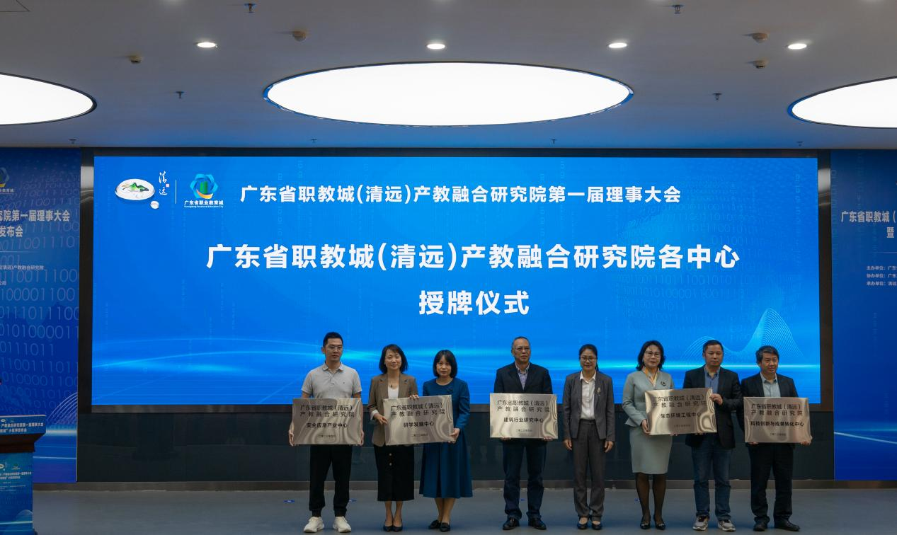 会议第二阶段,召开广东省职教城(清远)产教融合研究院第一届理事大会,与会代表举手表决通过《第一届副理事长单位、单位代表、秘书长名单》及《广东省职教城(清远)产教融合研究院章程修订案》。理事长段习文为副理事长单位授牌、为秘书长授聘书。研究院院长温秀媚为研究院科技创新与成果转化中心、生态环境工程中心、建筑行业研究中心、研学发展中心、安全应急产业中心代表进行授牌仪式。