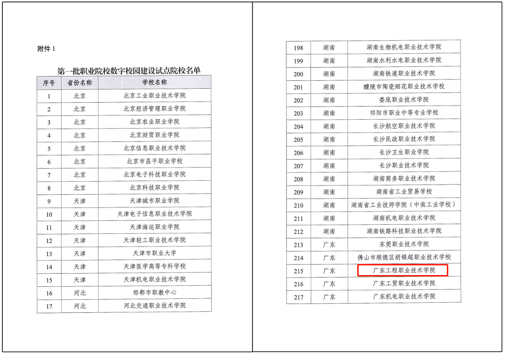 根据教育部职成司发布的《关于进一步推进职业院校数字校园建设试点的通知》,我校在学校党委的正确领导下,在校内各单位的全力支持配合下,经过1年多的持续建设,已于近期顺利通过教育部验收,成功入选第一批全国职业院校数字校园建设试点院校名单,此次我省共有深圳职业技术学院、广东轻工职业技术学院等17所院校入选。