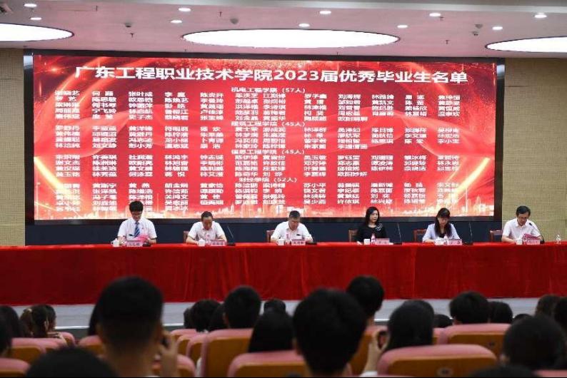6 月 20日下午,广东工程职业技术学院2023届毕业典礼在省职教城办公楼报告厅举行。本次毕业典礼采用“线下 +线上直播”的方式同步进行。党委书记吴琦琳,党委副书记、校长李丽,党委副书记、纪委书记徐振昌,党委副书记方燕,副校长吴志敏,副校长张小广,教师代表和毕业生代表在现场见证了人生特殊而珍贵的时刻。典礼由吴志敏副校长主持。