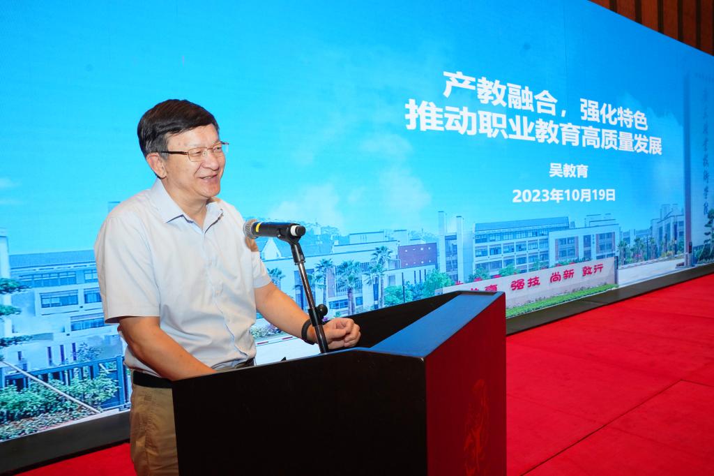 会上,广东职业技术学院校长吴教育、广东环境保护工程职业学院校长孙水裕围绕大会主题“构建高质量发展新生态 培育产教融合共同体”进行发言。吴教育校长分享了广东职业技术学院在深化产教融合、提升办学水平上的做法和经验,指出要以赛促学强特色、立足特色促服务、弘扬特色树品牌,不断强化办学特色,推动职业教育高质量发展。孙水裕校长从政策背景和现状问题入手,指出实现行业产教融合共同体“实体化”运作,需要各方达成共识,多方发力,真抓实干。