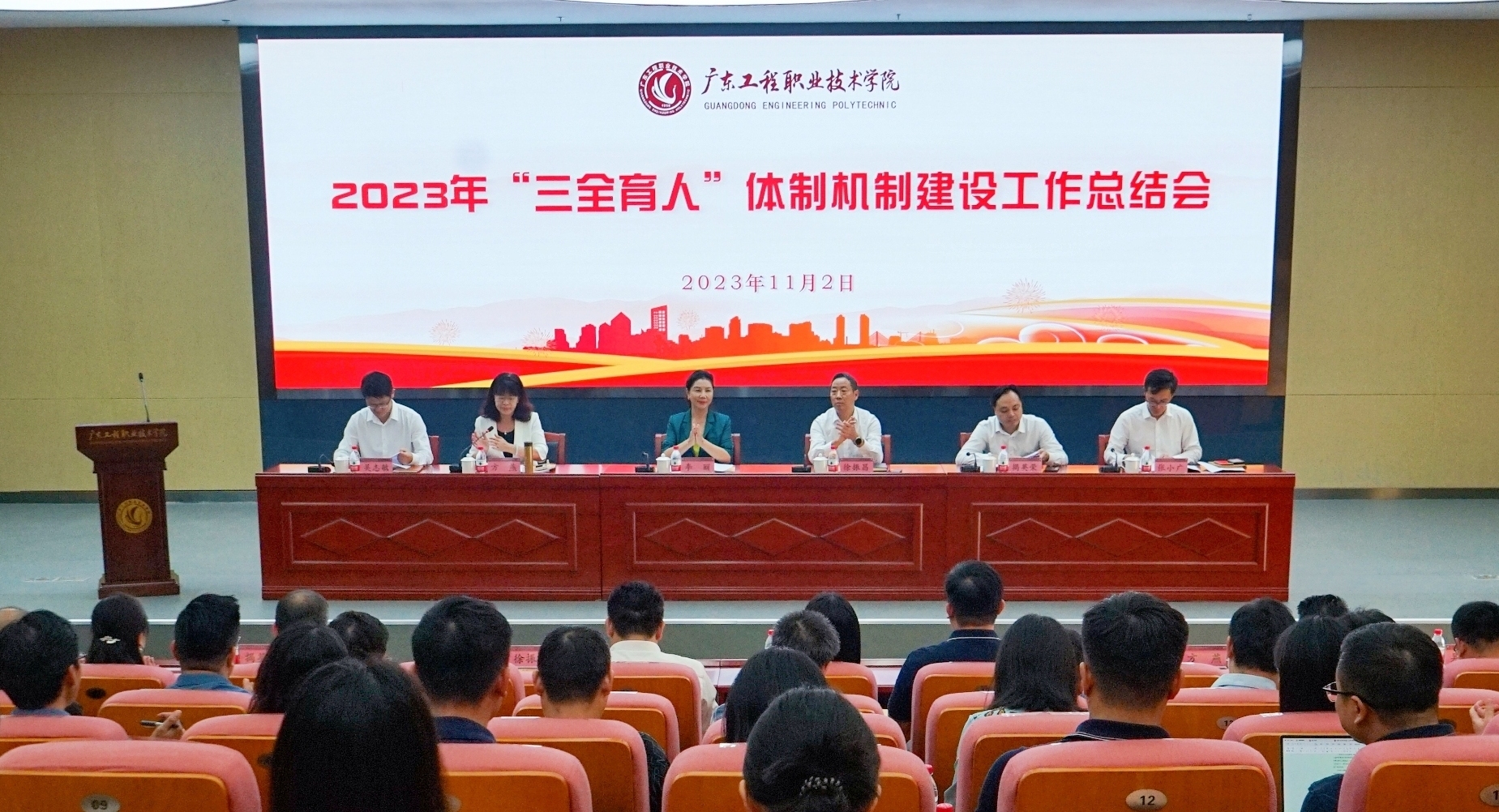 11月2日下午,学校在清远校区办公楼一楼报告厅召开2023年“三全育人”体制机制建设工作总结会。学校党委副书记、校长李丽出席大会并讲话,党委副书记、纪委书记徐振昌,党委副书记方燕,党委委员、副校长揭英荣,党委委员、副校长吴志敏,党委委员、副校长张小广出席会议。参加会议的还有学校全体中层干部、马克思主义学院教师代表以及各学院辅导员代表。学校党委副书记方燕主持会议。
