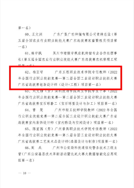 近日,广东省总工会印发了《关于授予2022年度广东省职工职业技能竞赛第一名选手和团队广东省五一劳动奖的决定》,我校艺术设计学院专任教师杨亚穹被授予广东省五一劳动奖章,这是我校首次获此殊荣。